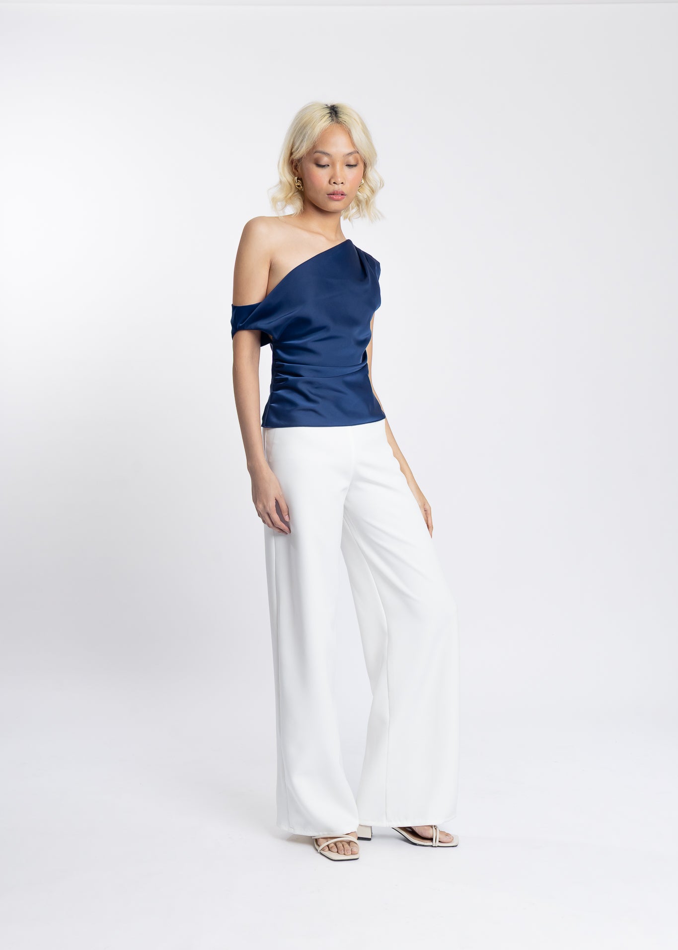 BRYONY — A sophisticated one-shoulder satin top designed with soft draping that flatters the silhouette. Its sleek, asymmetric neckline adds a modern, elegant touch—perfect for effortlessly elevated day-to-evening styling.