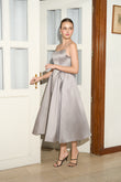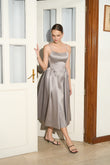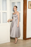 Understated and romantic, this gazar dress is designed with slim spaghetti straps and a soft, sculpted scoop neckline that gently frames the collarbone. The fitted bodice flows seamlessly into a voluminous midi skirt, enhanced with delicate side gathers that create graceful fullness and movement. Crafted from luminous gazar, the fabric offers structure with a subtle sheen, giving the dress an elevated, elegant finish. Effortlessly refined, it’s a timeless choice for daytime celebrations, evening gatherings, and special occasions.