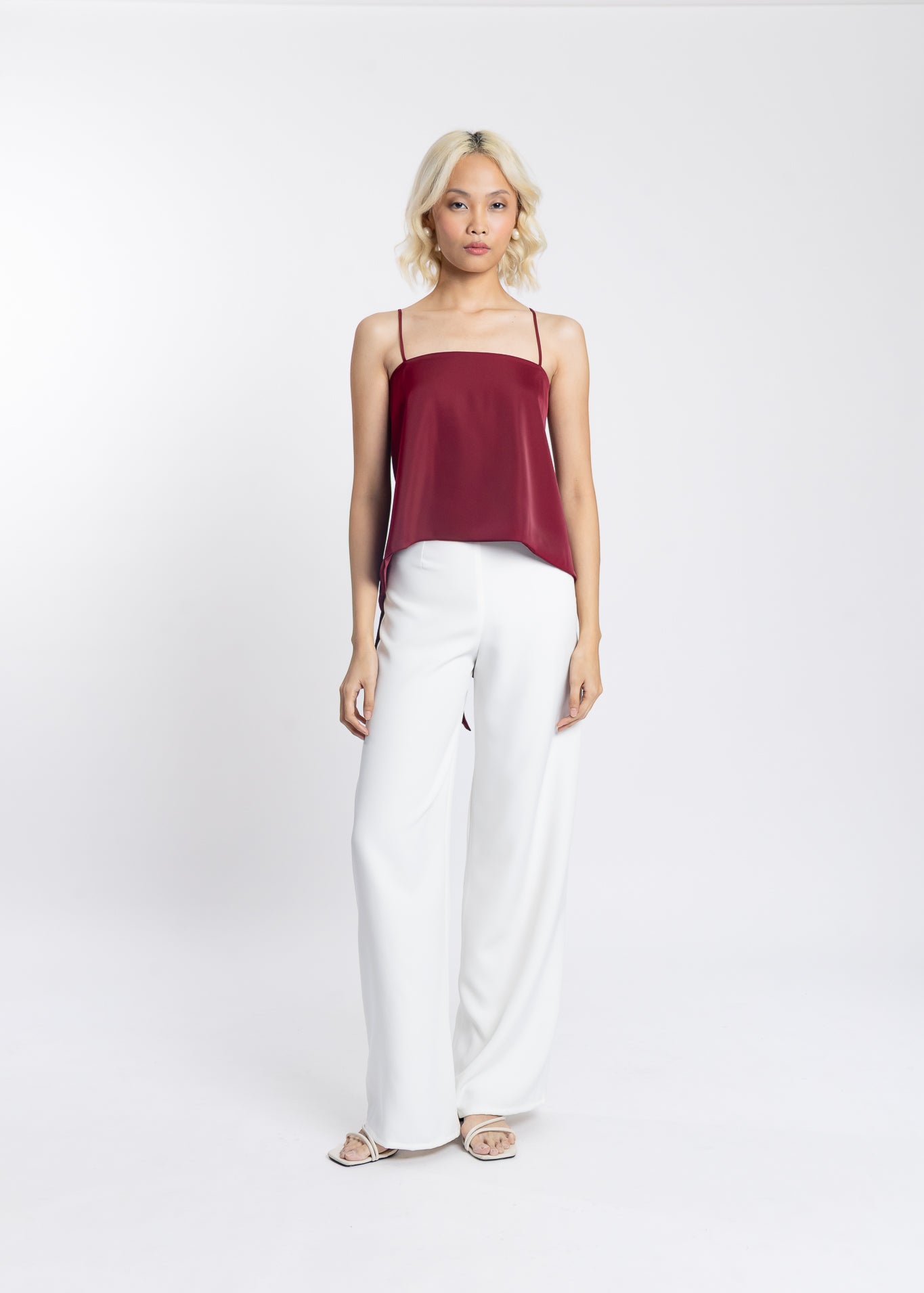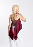 CONSTANCE — A sleek satin cami designed for effortless elegance. Featuring delicate spaghetti straps and a soft, fluid silhouette, this top drapes beautifully with an asymmetrical hem and a striking open-back tie detail. Perfect for elevating both casual and evening looks with a touch of modern sophistication.