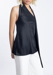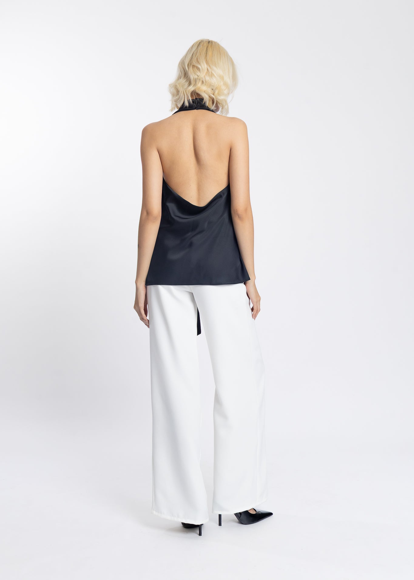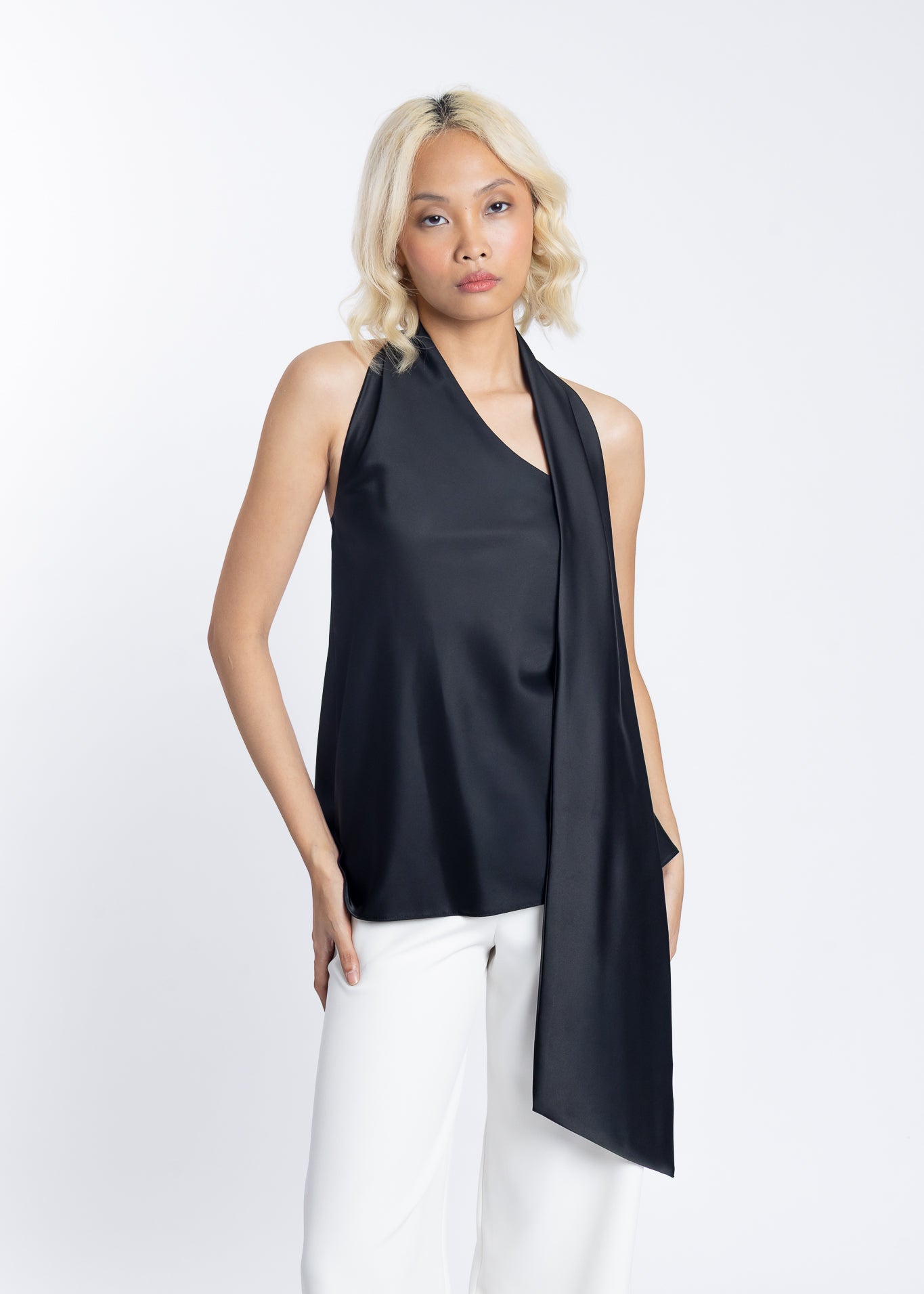 DOLORES — A sophisticated halter top crafted from smooth satin fabric with a sleek, fluid finish. Designed with a graceful scarf detail and an elegant open-back silhouette for a refined statement look. Perfect for pairing with tailored trousers for effortless evening elegance.