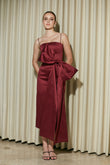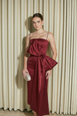 Modern and statement-making, this gazar dress features delicate spaghetti straps and a sleek, sculpted bodice that flatters the figure. At the waist, an oversized architectural bow creates beautiful volume and drama, while the structured gazar fabric holds its shape with a refined sheen. The skirt falls into a straight, midi-length silhouette with a clean back slit for ease and movement. Effortlessly elegant yet undeniably striking, this piece is perfect for evening events, receptions, and special celebrations.